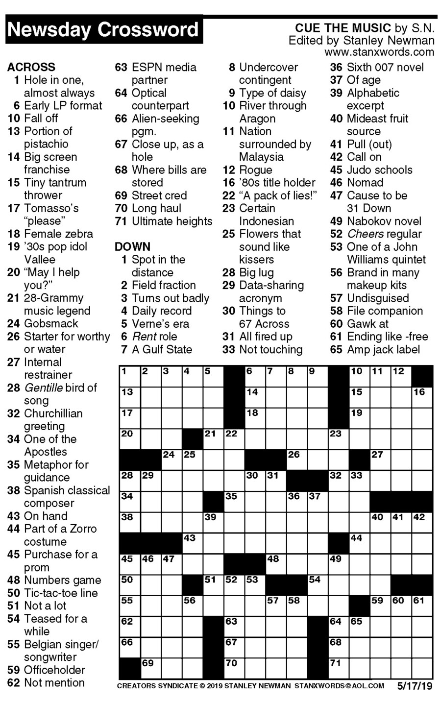 Newsday Crossword Puzzle for May 17, 2019, by Stanley Newman Creators Syndicate