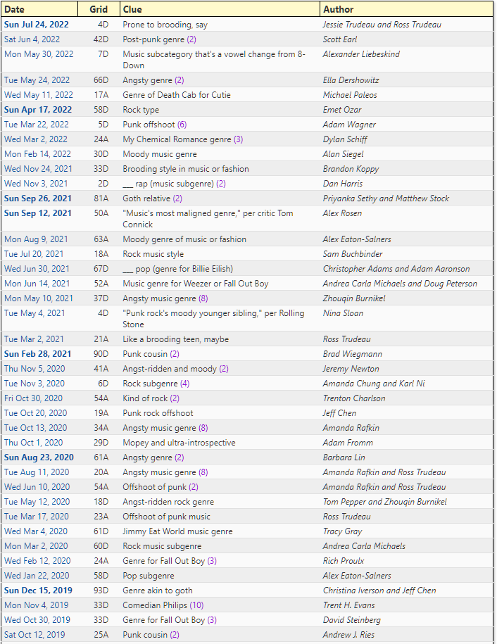 A collection of crossword questions from the New York Times with "emo" as the answer r/Emo