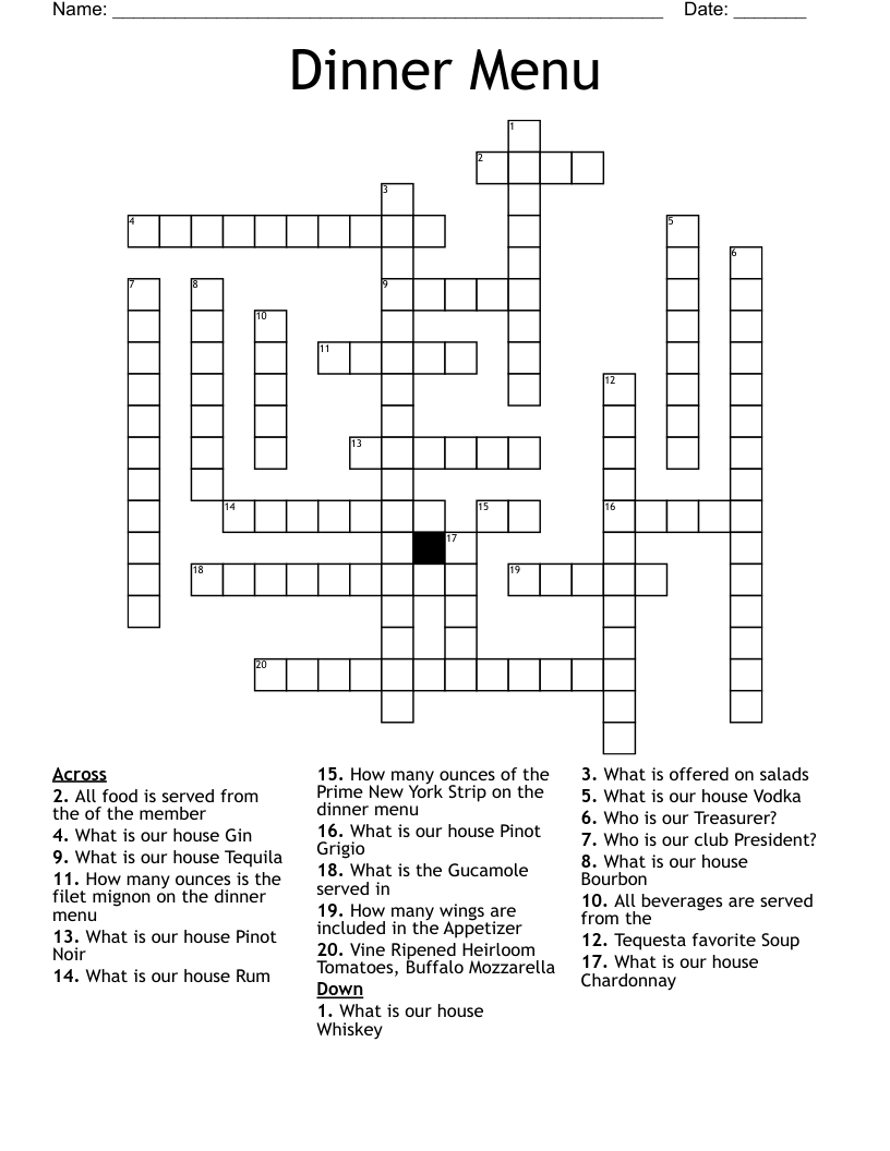 Dinner Menu Crossword Puzzle Crossword Puzzle