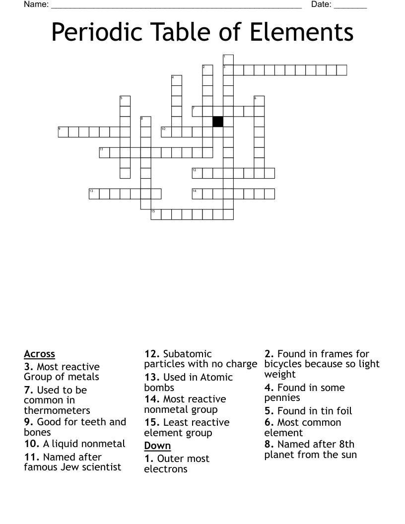 Periodic Table Of Elements Crossword - Web interactive chemistry crossword about elements in the periodic table, to play online or to print out and solve later. Web this element crossword puzzle is a fun and engaging way to introduce element symbols and names of the first 18. Web the player reads the question or clue, and tries to find a word that answers the question in the same amount of letters as there are boxes in the related. Customize with your own questions, images, and more. Print, save as a pdf or word doc. Web the player reads the question or clue, and tries to find a word that answers the question in the same amount of letters as there are boxes in the related. Web crossword with 27 clues. Web the crossword solver found 30 answers to periodic table of elements, 13 letters crossword clue. Web this educational puzzle challenges you to match the symbols of elements to their corresponding names, delving into the.